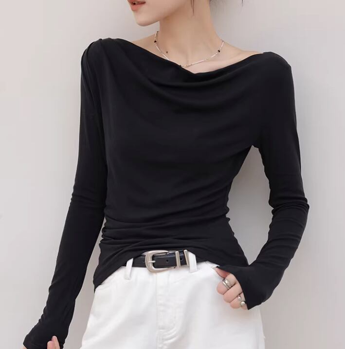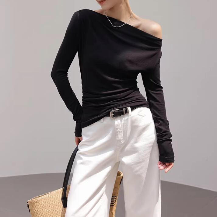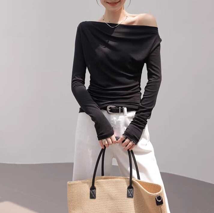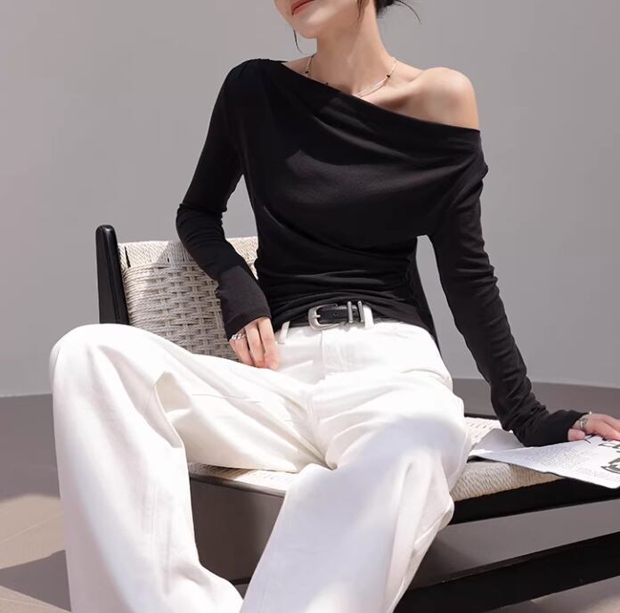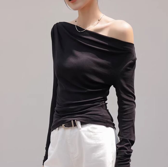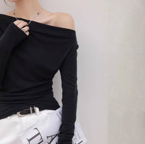 流行のワンショルダーが魅力のオフショルダー トップス ブラック。
