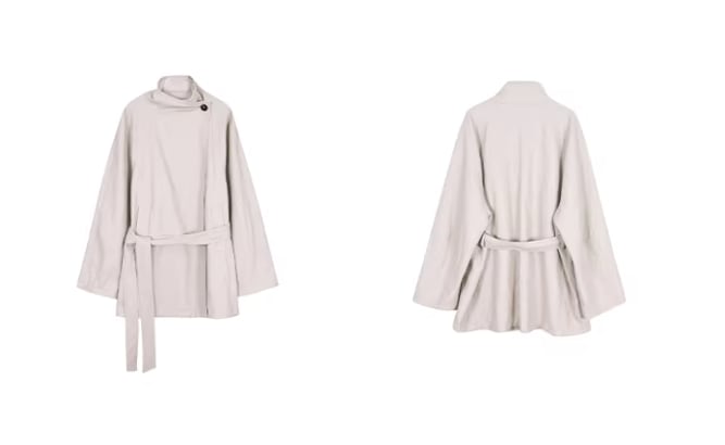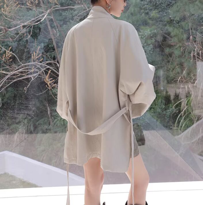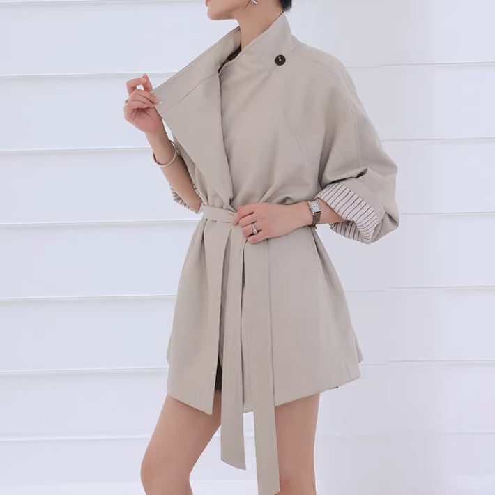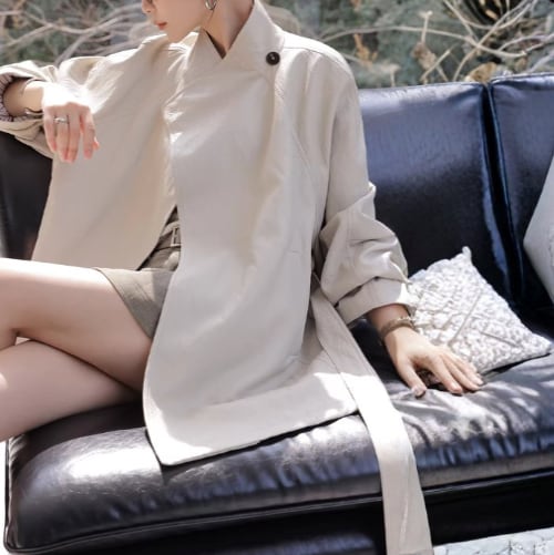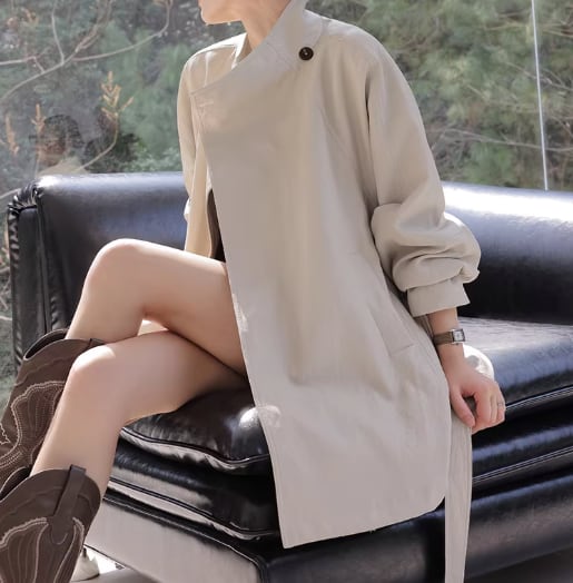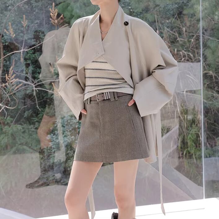 軽やかなレザー素材で仕立てられたハーフトレンチデザインが、大人の女性らしいスタイルを演出します。