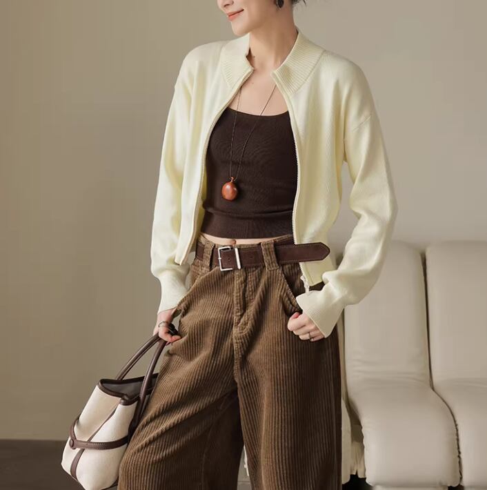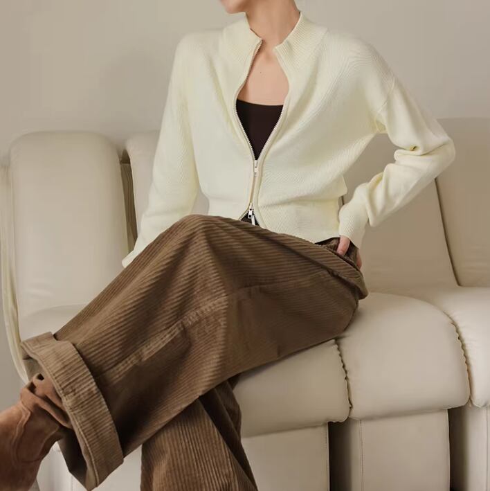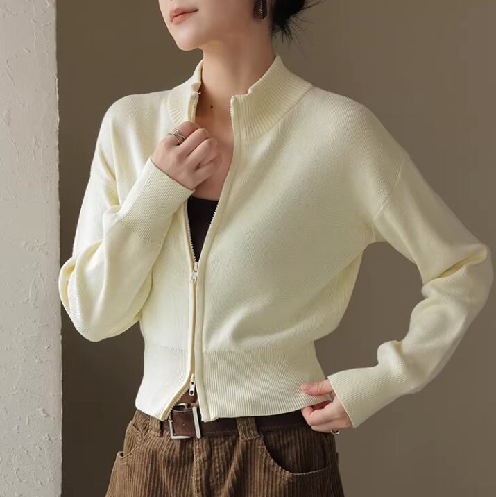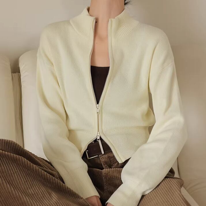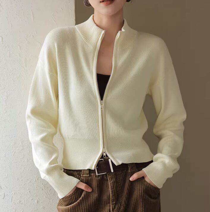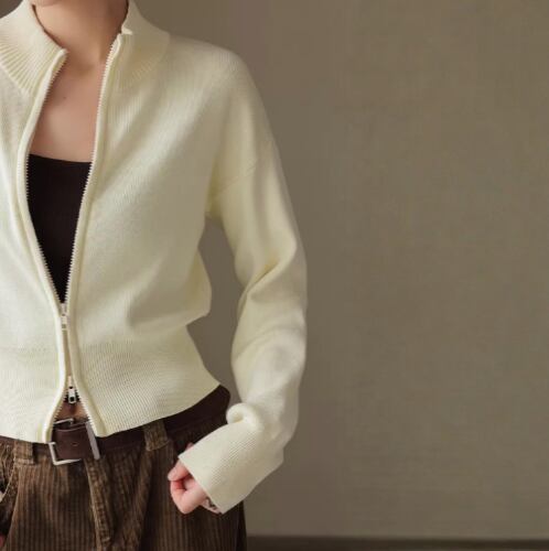 流行のダブルジッパーデザインが魅力のカーディガン、ホワイト。
