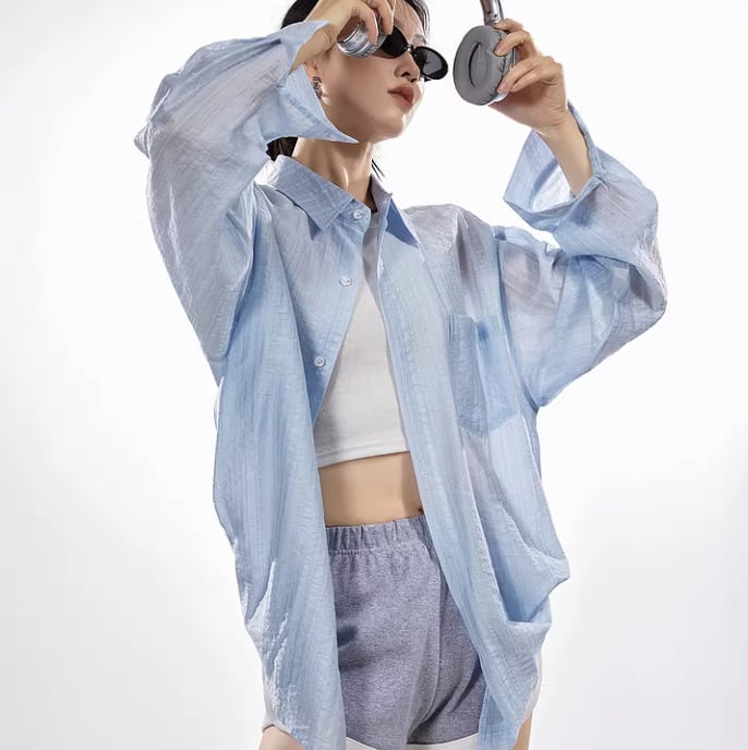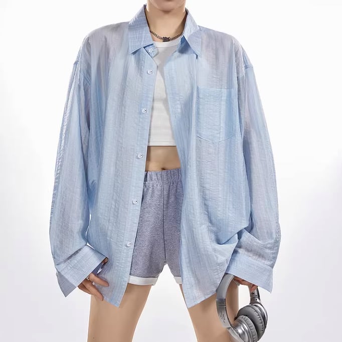 流行の透け感が魅力のブルーシャツ。