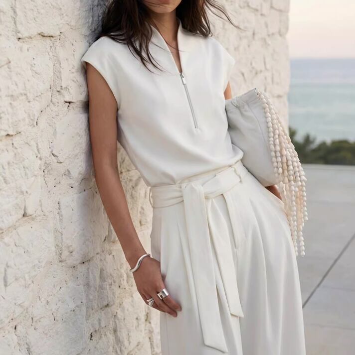 軽やかなホワイトカラーは、どんなボトムスとも合わせやすく、季節を問わず着用できるので重宝するアイテムです。ジップのディテールがアクセントとなり、スタイリッシュさを演出してくれます。このトップスで、あなたのスタイルをさらに洗練させるチャンスです!