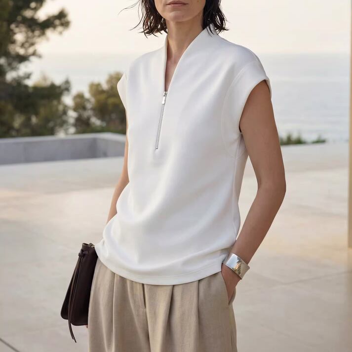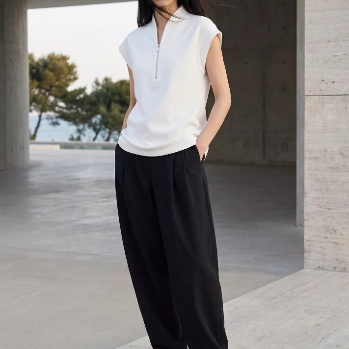 シンプルでいて洗練されたデザインのジップ付きノースリーブトップスです。スリムなシルエットが体のラインを美しく引き立て、カジュアルなシーンからお出かけスタイルまで幅広く活躍します。