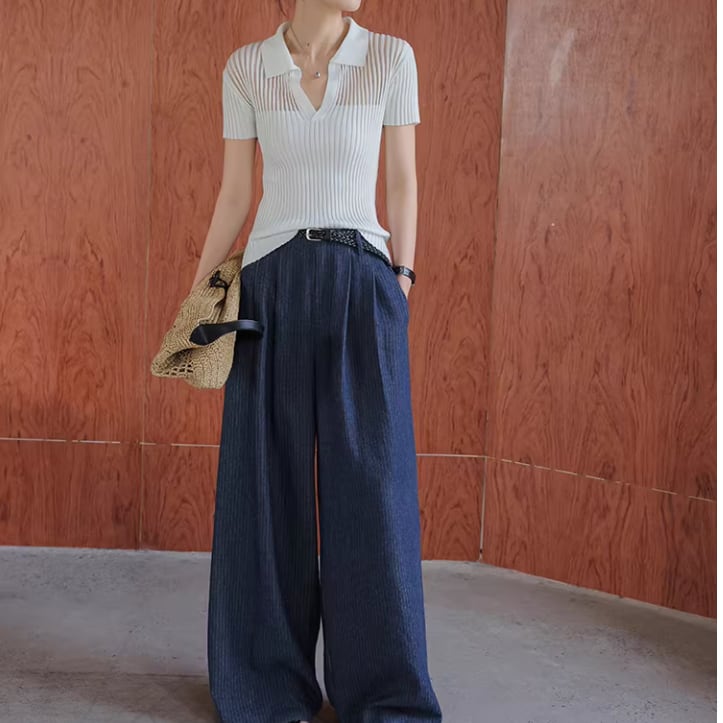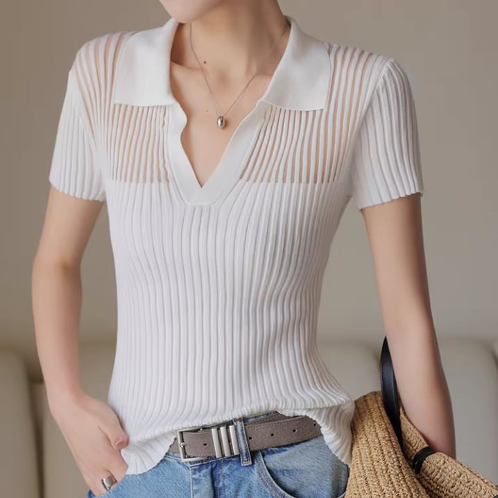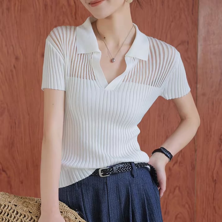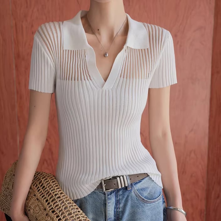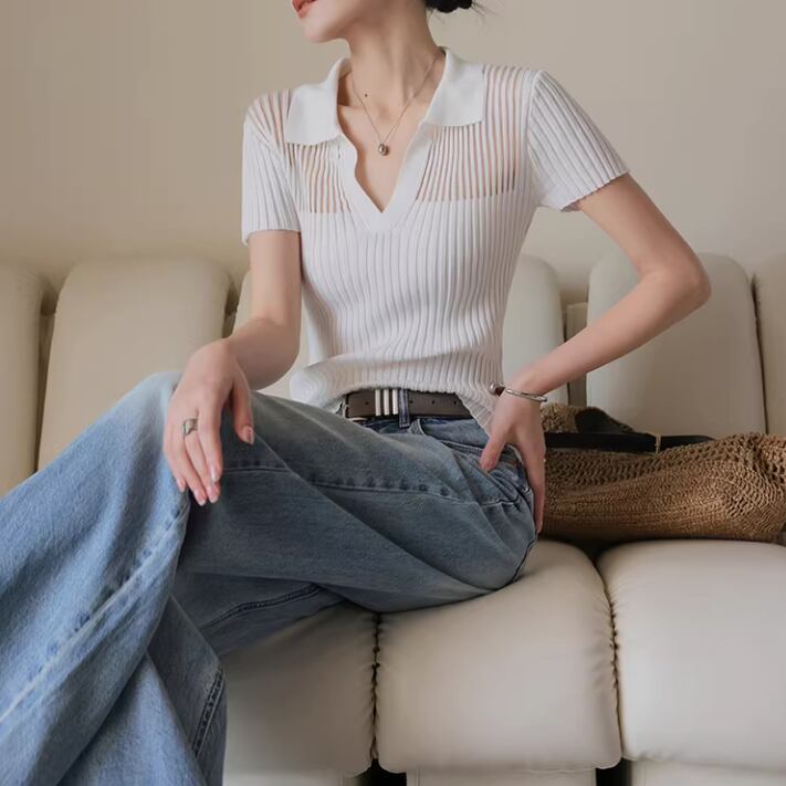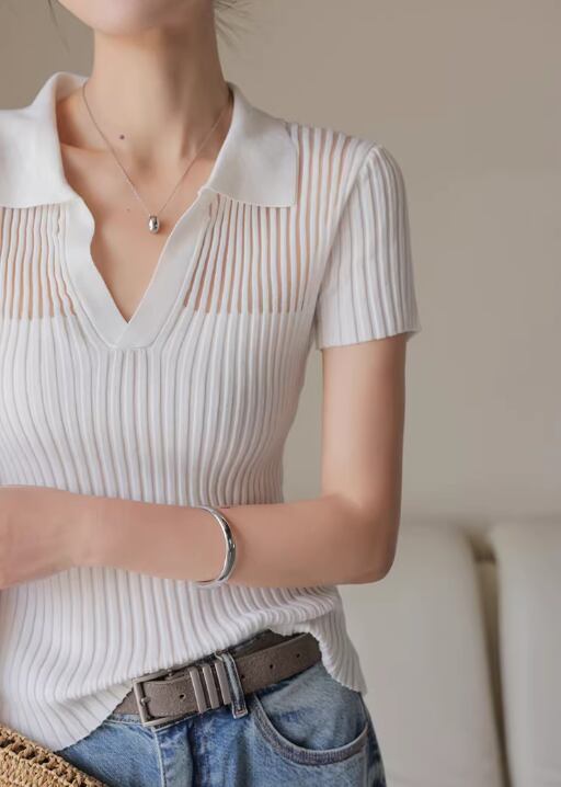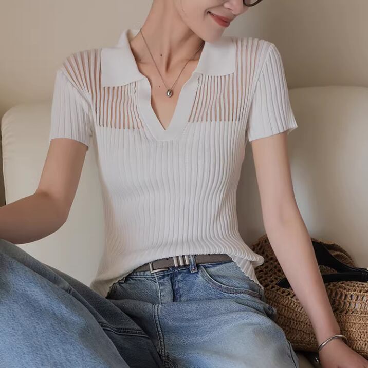 エレガントでありながらもカジュアルな印象のシースルーリブニットシャツです。程よい透け感があり、季節を問わずさまざまなスタイリングに対応します。リブ編みが体にフィットし、女性らしい美しいシルエットを強調します。