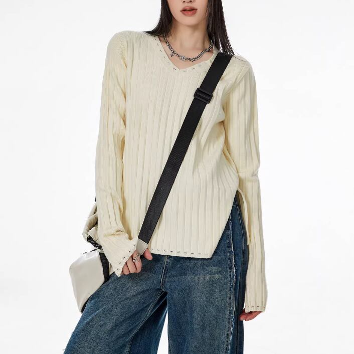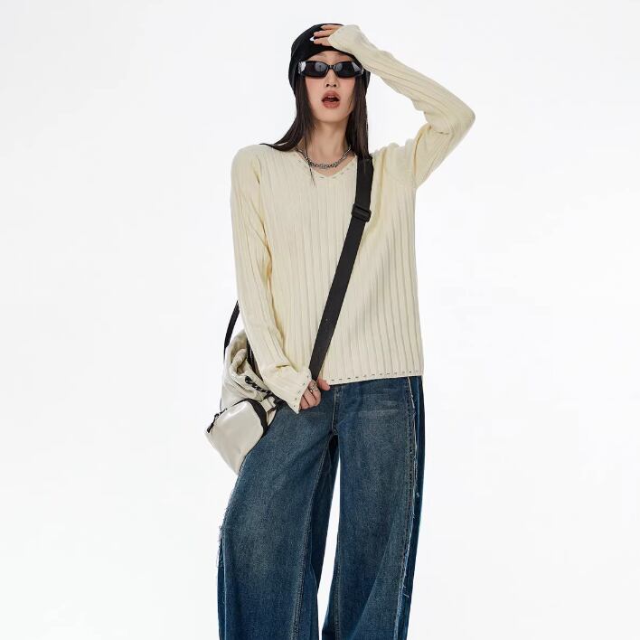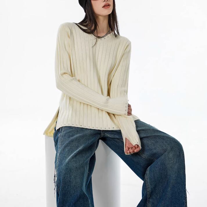 清潔感とスタイルを兼ね備えたスティッチ入りのホワイトニットです。ふんわり優しいニット素材が肌に触れ、リラックスした着心地を提供します。また、丁寧に施されたスティッチデザインがアクセントとなり、シンプルながらも個性的な印象を与える一着です。
