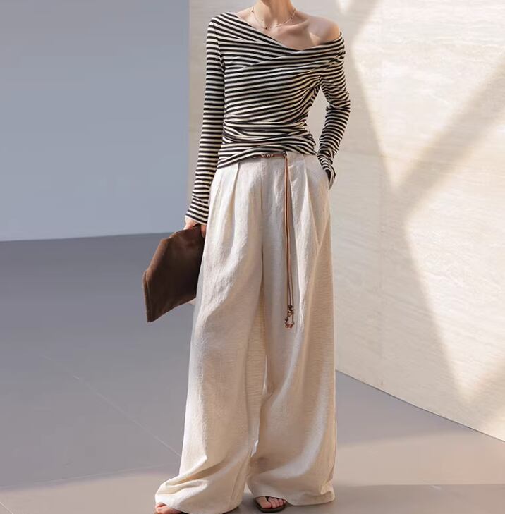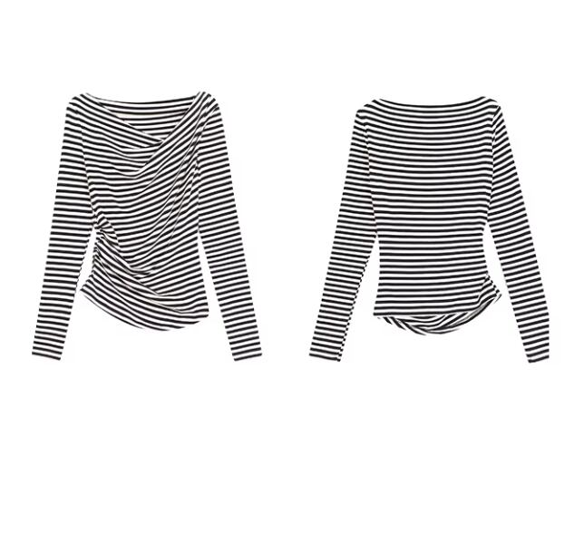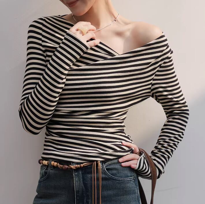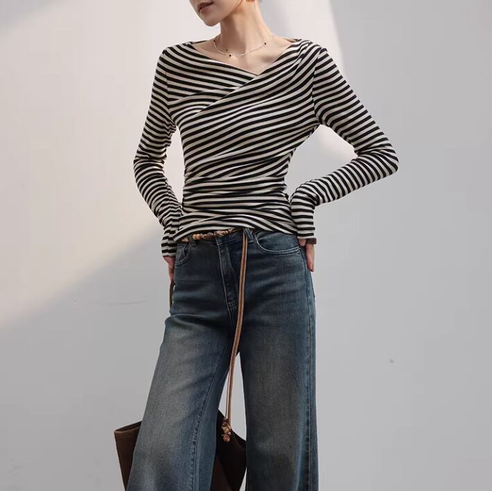 洗練されたデザインが魅力的なボーダー柄の長袖トップスです。肌触りの良い素材を使用しており、やわらかさと快適さを両立しました。軽やかなボーダーデザインはカジュアルにもフォーマルにも合わせやすく、さまざまなシーンで活躍します。