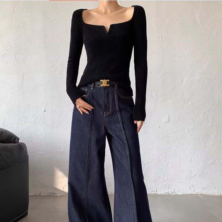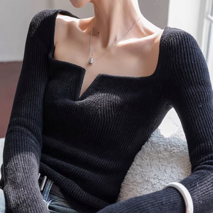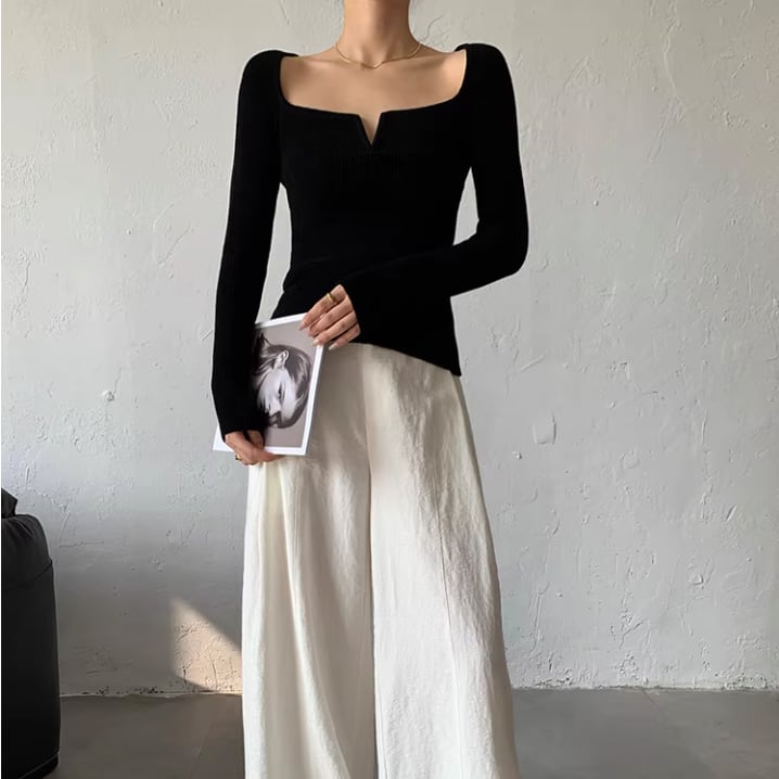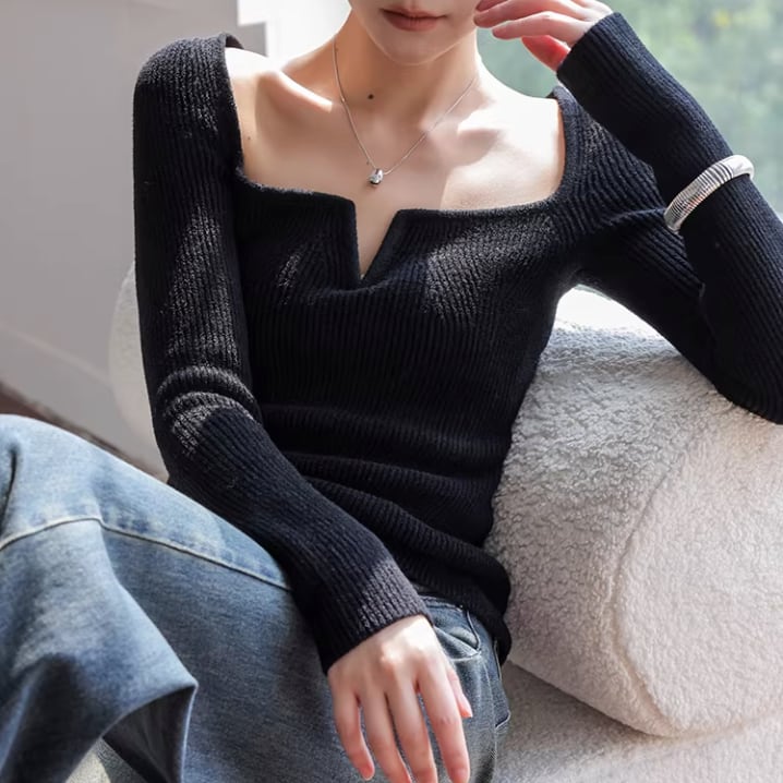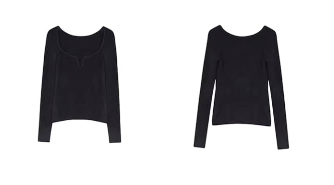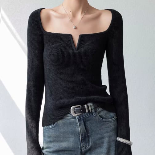 【デコルテを美しく魅せる】オープンスクエアネック BLACK モードカジュアル トップス /041