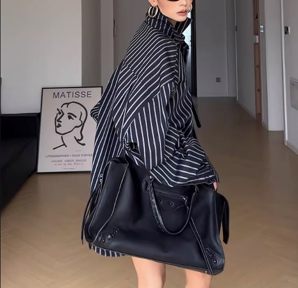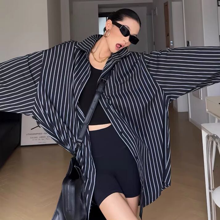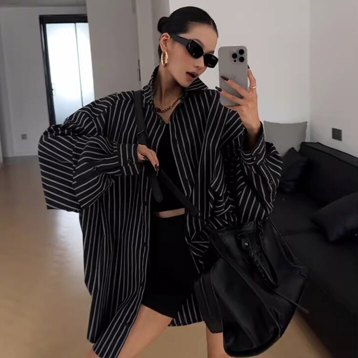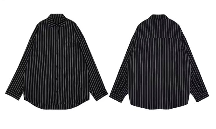 シックで洗練されたブラックストライプデザインが印象的なビックシャツです。リラックス感のあるシルエットは、カジュアルからビジネスシーンまで幅広く対応できるアイテムです!