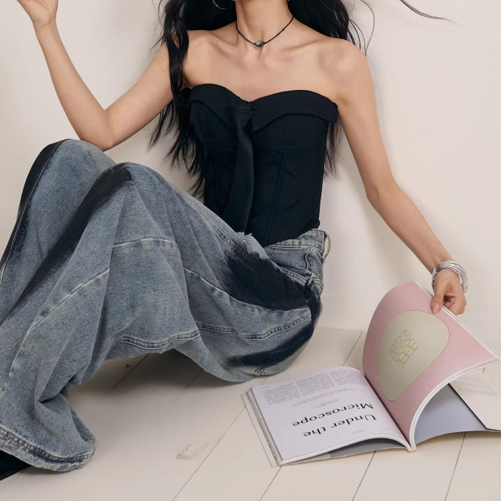 ラフさの中に計算されたシルエット。ダメージ加工が程よい抜け感を演出し、カーブデザインが立体的なラインを生み出すデニムパンツ。履くだけでこなれたバランスが完成し、シンプルなトップスでも一気に“キマる”一本に。カジュアルで終わらせない、どこかモードな雰囲気がリブラらしい。日常にエッジを効かせる主役デニム。
