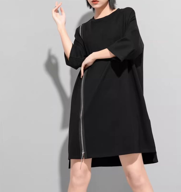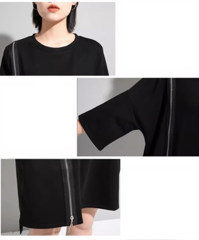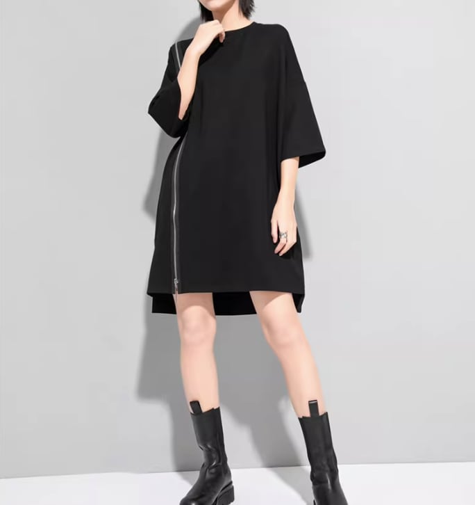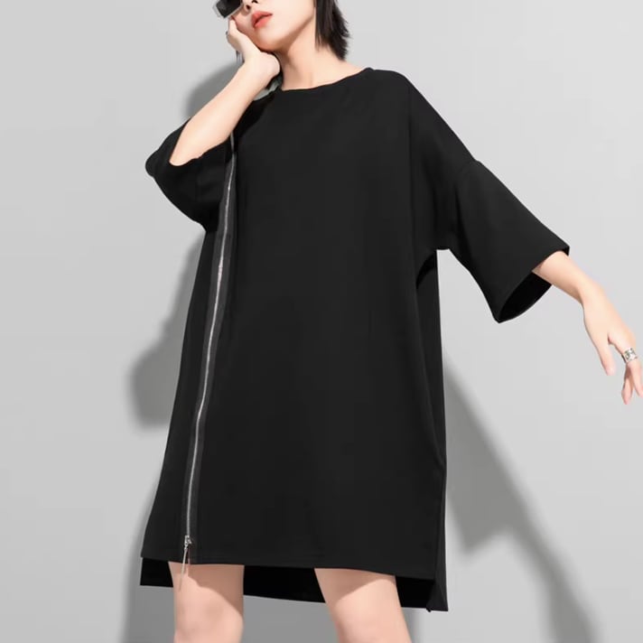 シンプルに見せて、しっかり攻める。サイドに大胆に走るジッパーデザインが視線を奪う、ビッグTシャツワンピース。ルーズなシルエットで抜け感を出しつつ、無骨さと洗練を両立した一枚に仕上げた。1枚で“キマる”バランスだから、コーデに迷わない。ラフなのにどこかエッジが効いた、カジュアルモードを体現する一着。