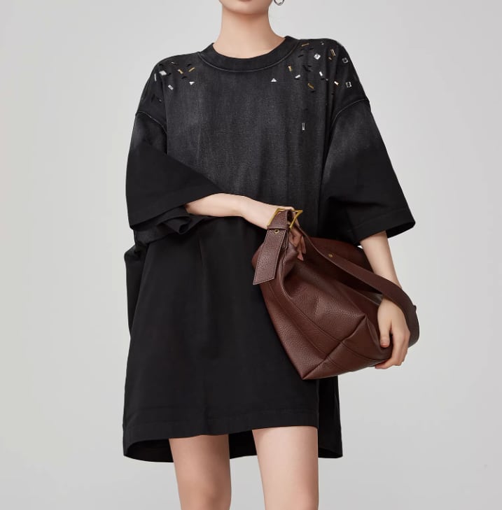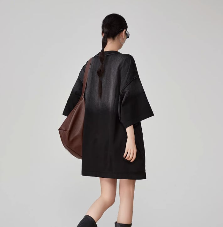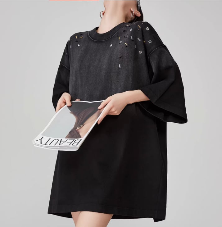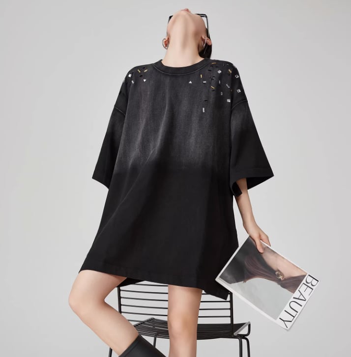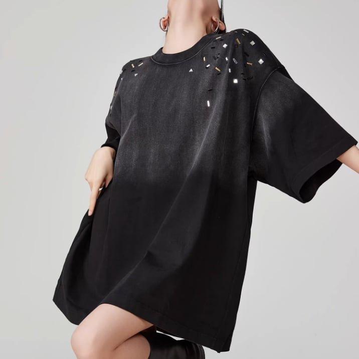 ブラックのグラデーションとビジューの輝きが織りなす、特別なビッグTワンピース。ビジューがもたらす華やかさが、カジュアルスタイルに上品な印象をプラスします。デニムやスニーカーとの相性も良く、デイリーユースに最適な一着です。