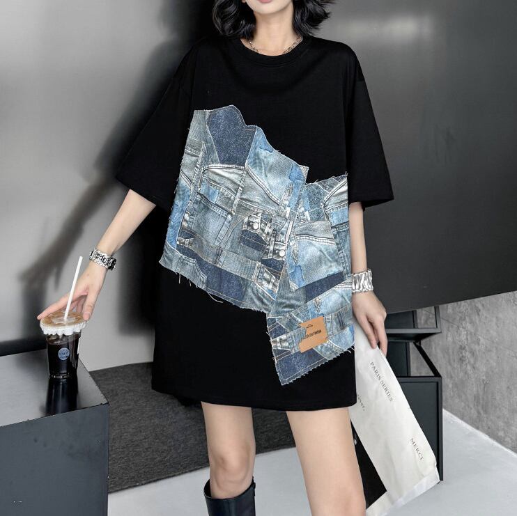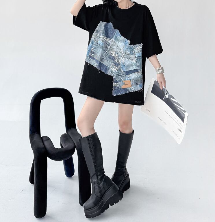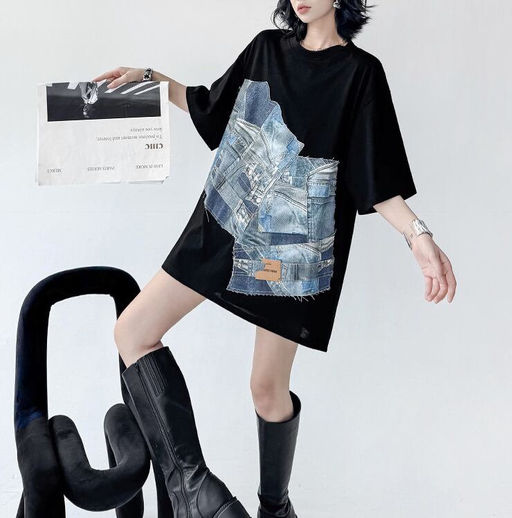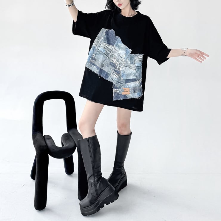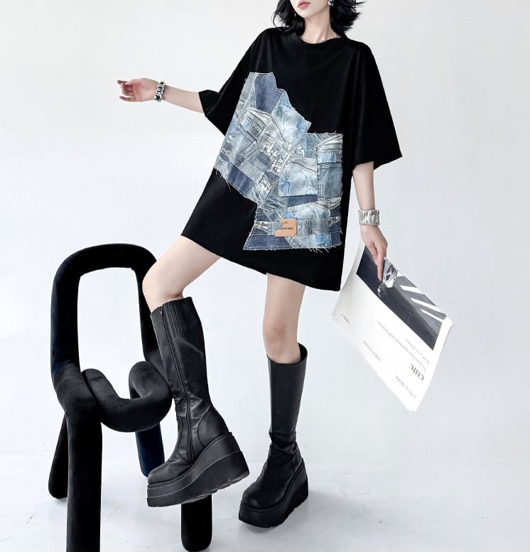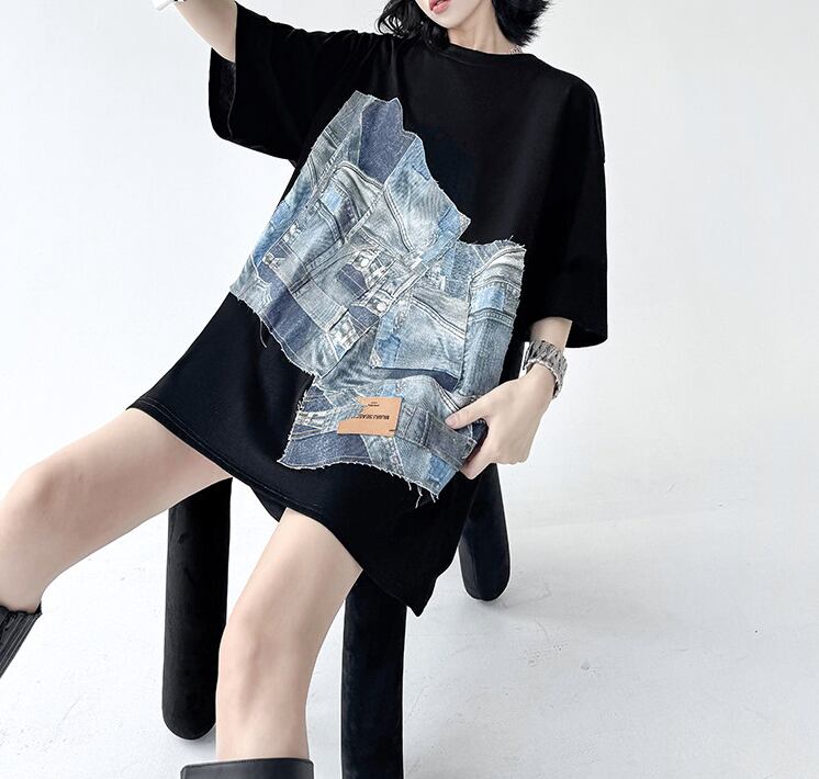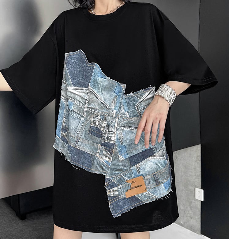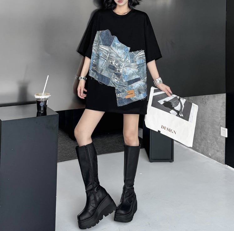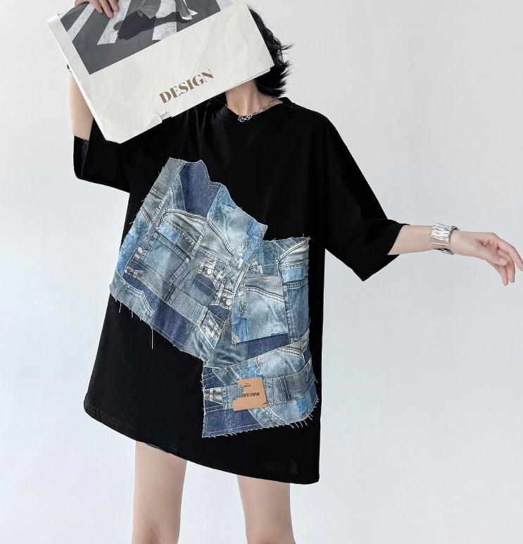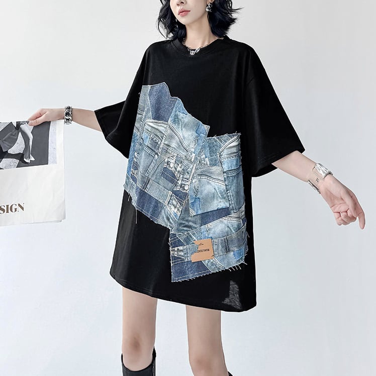 個性的なデニムパッチワークデザインが魅力のビックTシャツ。異なるデニム生地が組み合わさった独特のスタイルで、コーディネートに個性をプラスします。ゆったりとしたシルエットは、リラックスした着心地を提供し、カジュアルなお出かけから特別なイベントまで幅広く活躍すること間違いなしのアイテムです!