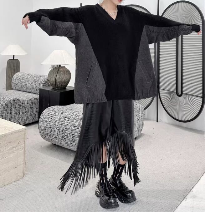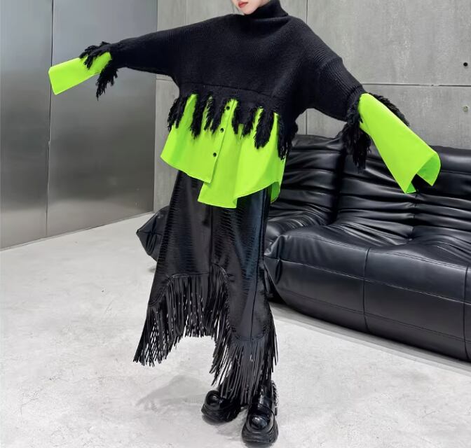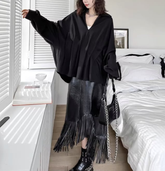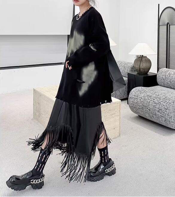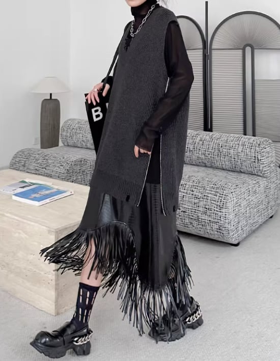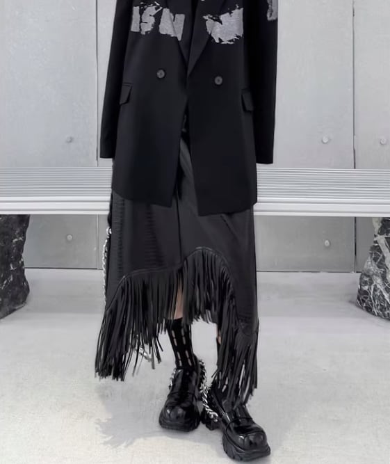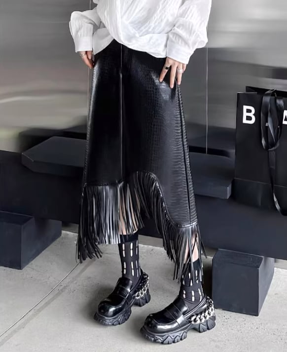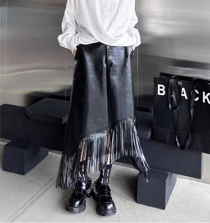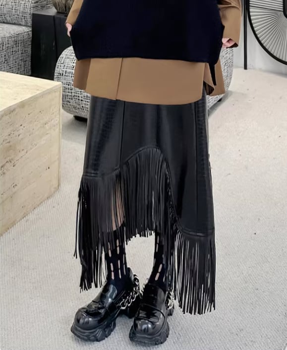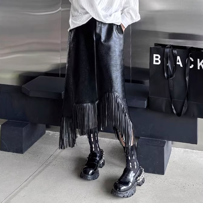 エッジの効いたデザインが光るフリンジ付きフェイクレザースカート。大胆なフリンジが動くたびに揺れ、スタイリングに遊び心を与えます。このアイテムは、カジュアルからきれいめまで幅広いコーディネートに活躍すること間違いなしです!