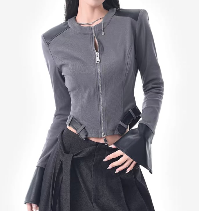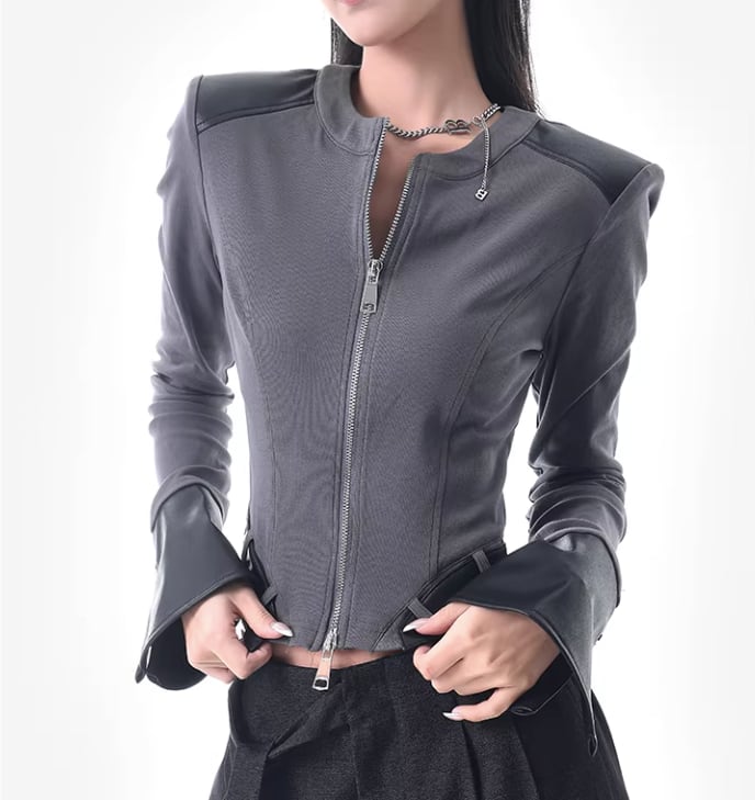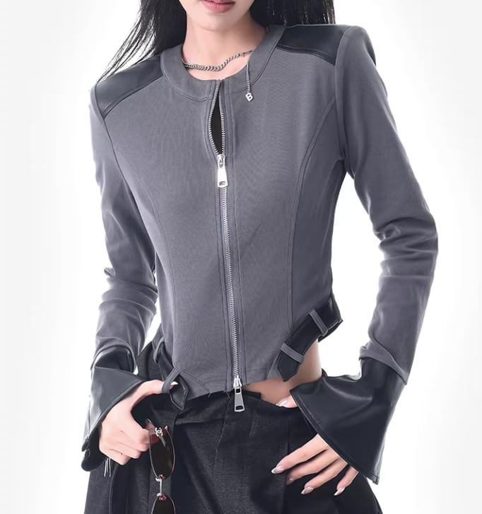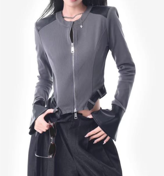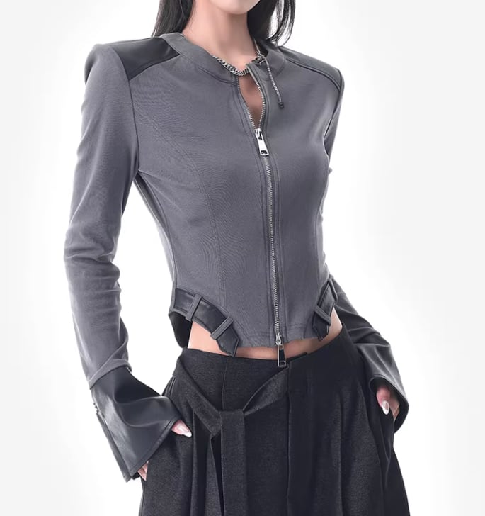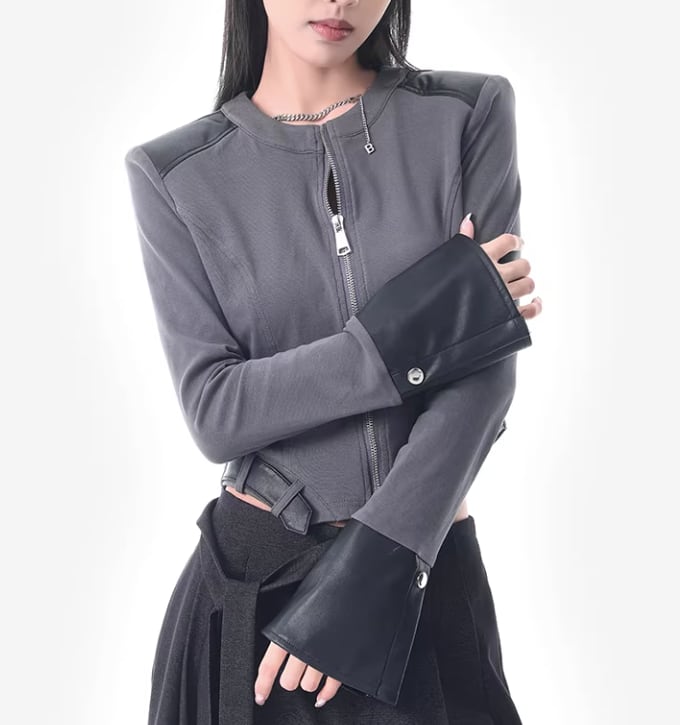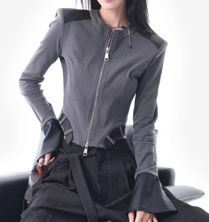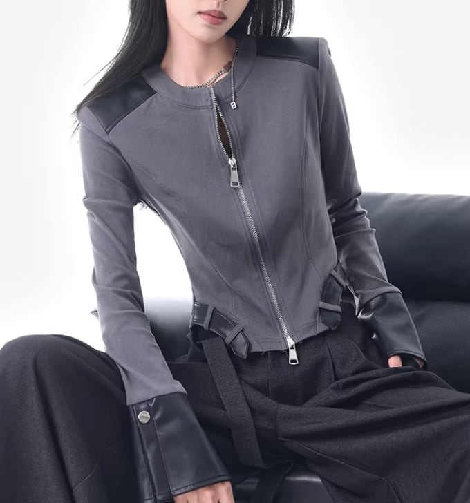 レザー風 パッチワークトップス ダブルジッパー風デザイン /080