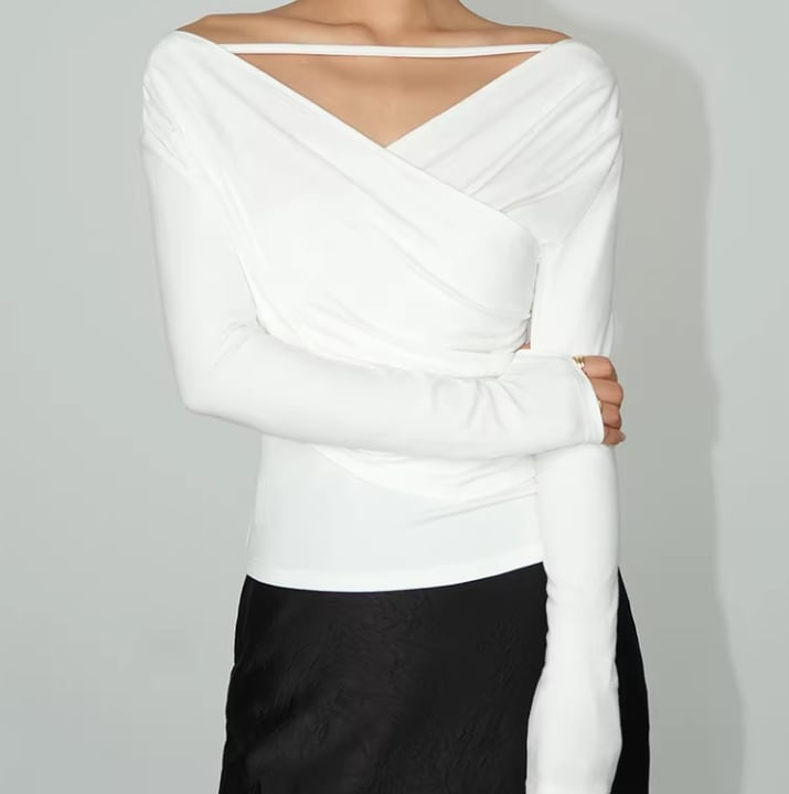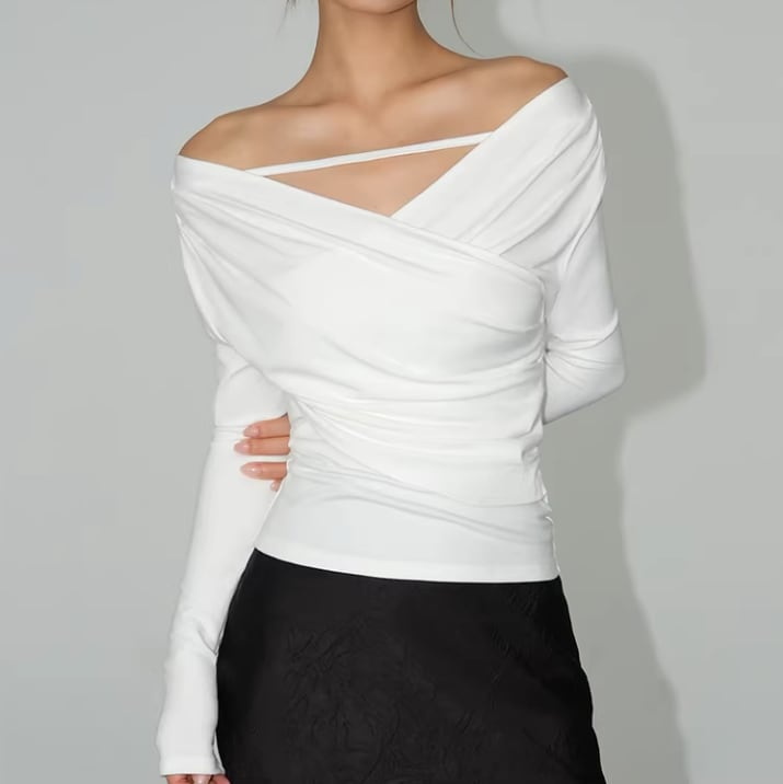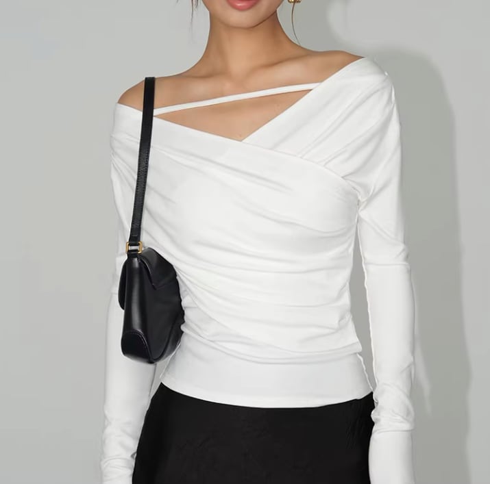 デコルテのラインが魅力的なVネックオフショルダー、ブラック。洗練されたオフホワイトが女性らしさを引き立て、さまざまなスタイルにマッチします。カジュアルな日常使いはもちろん、特別なお出かけにもぴったりな一枚です!シーンを選ばず活躍するアイテムとなっています。