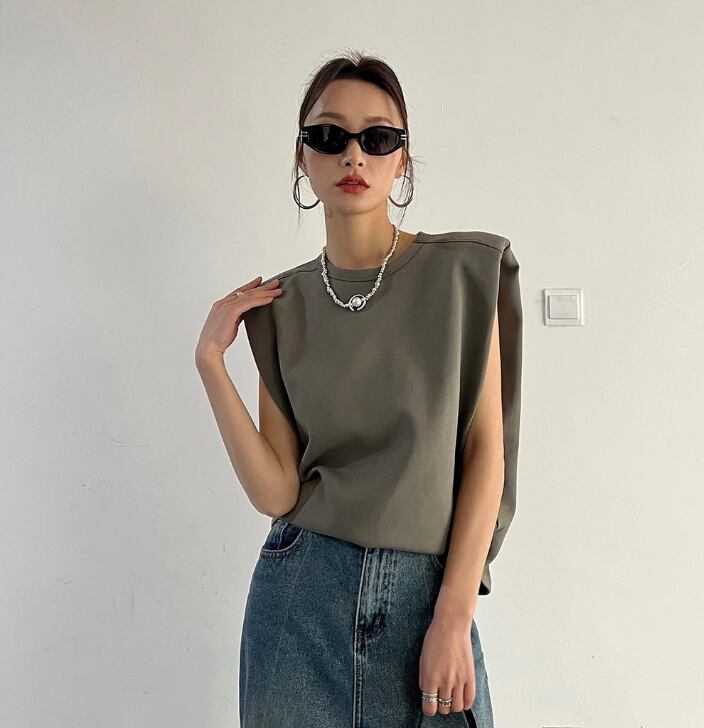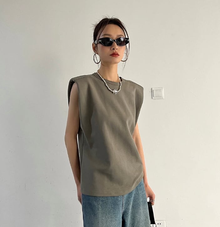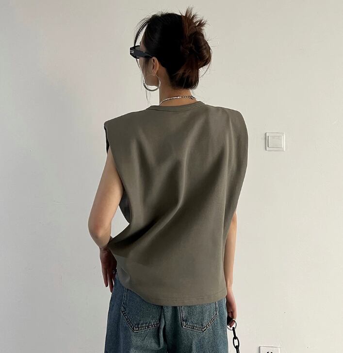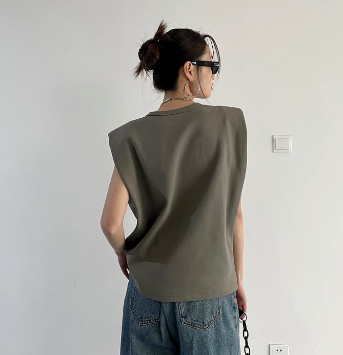 シンプルながらもスタイリッシュな肩パッド入りノースリーブ、ブラック。肩パッドが程よいボリューム感を演出し、洗練されたシルエットを作り出します。コーディネート次第でカジュアルにもフォーマルにも対応でき、さまざまなシーンで活躍するアイテムです!スマートに魅せる一枚として、あなたのワードローブに加えてみてはいかがでしょうか。