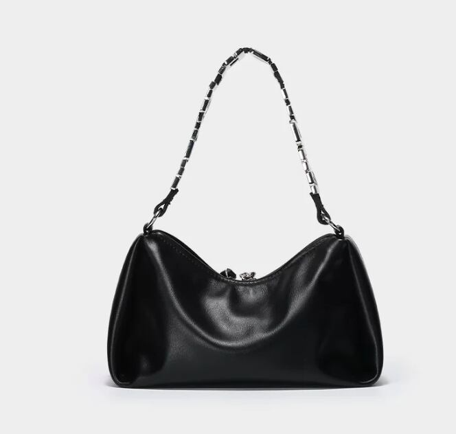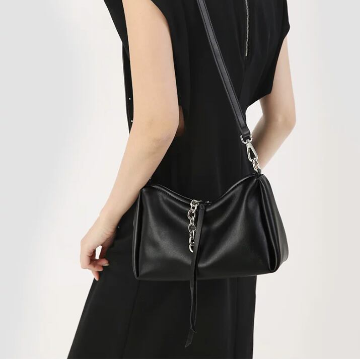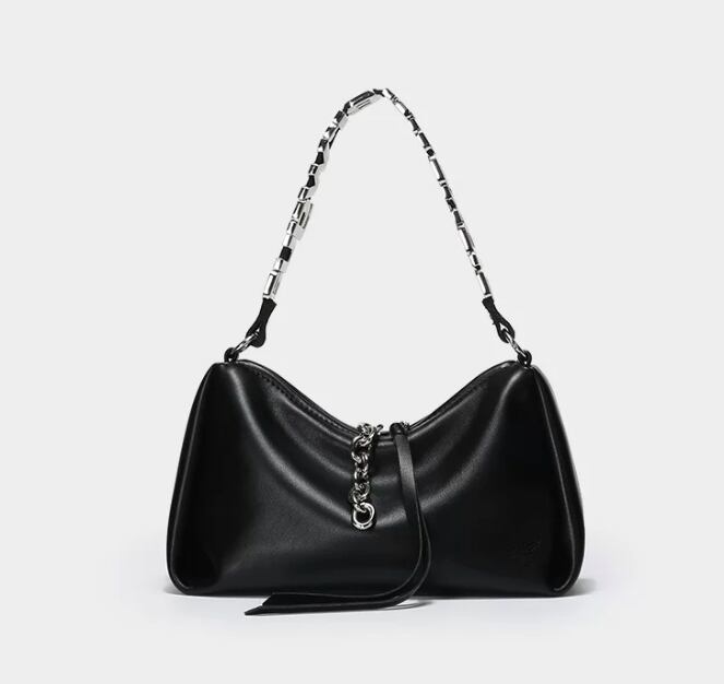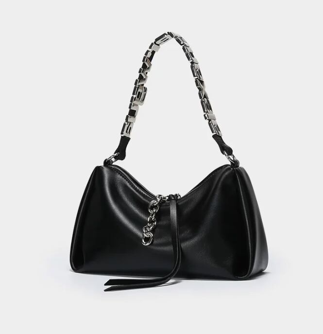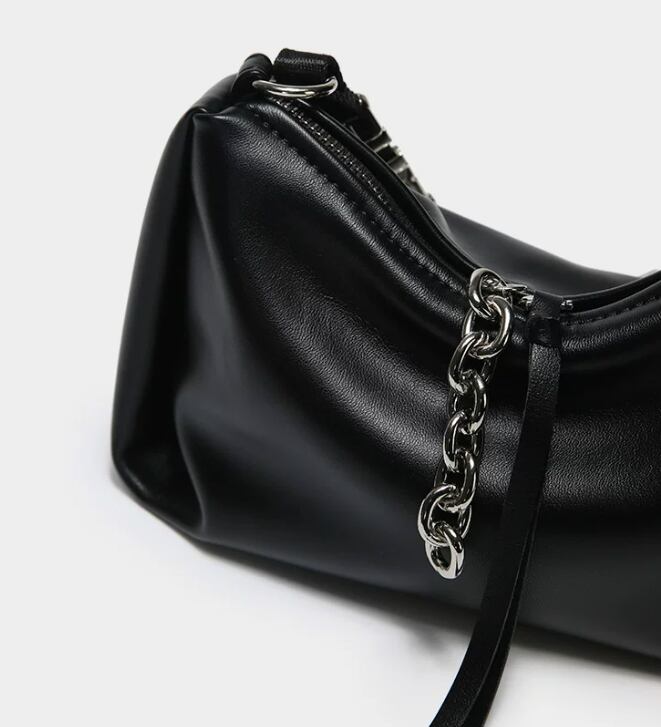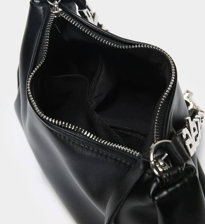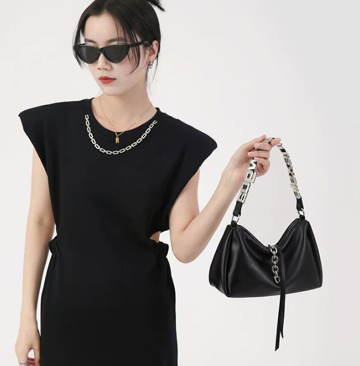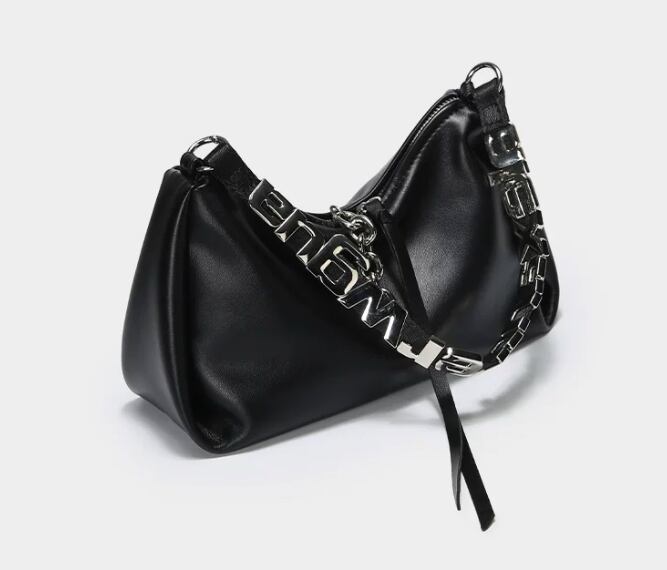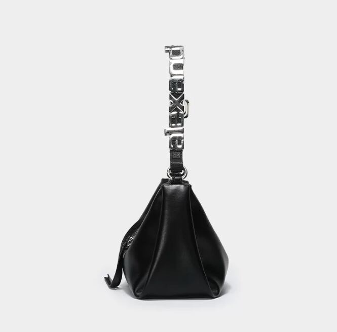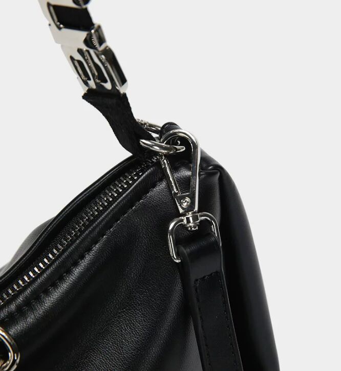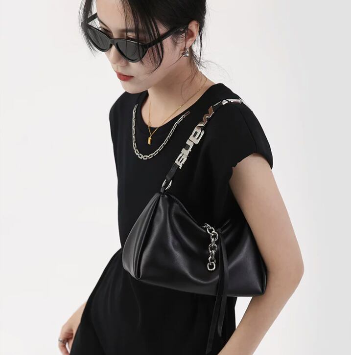 スタイリッシュで目を引くレタリングデザインのブラックショルダーバッグ。モードカジュアルな印象を与え、普段使いから特別なシーンまで幅広く活躍できるアイテムです!シンプルなコーディネートにアクセントを加え、持つだけで洗練されたスタイルを演出します。