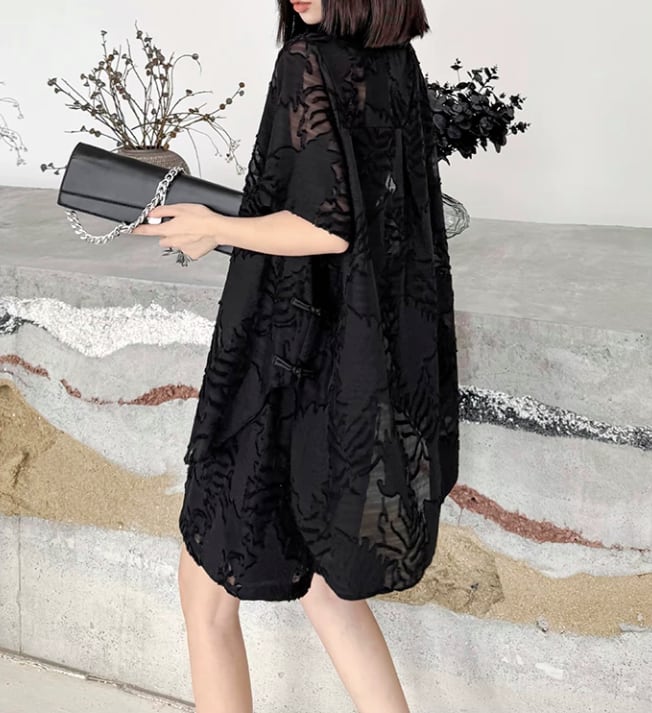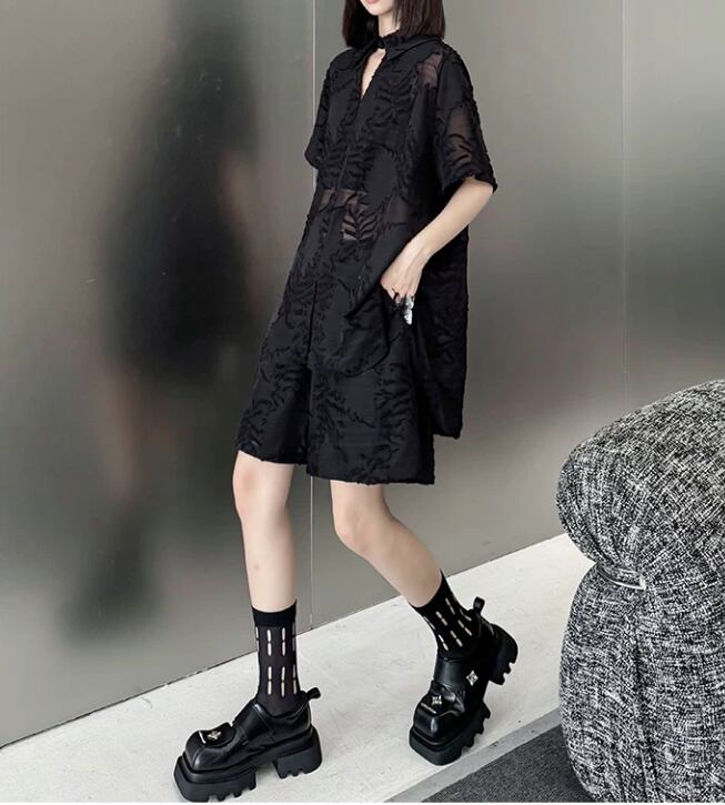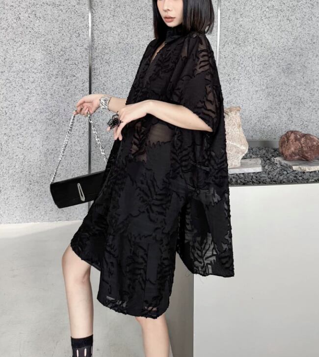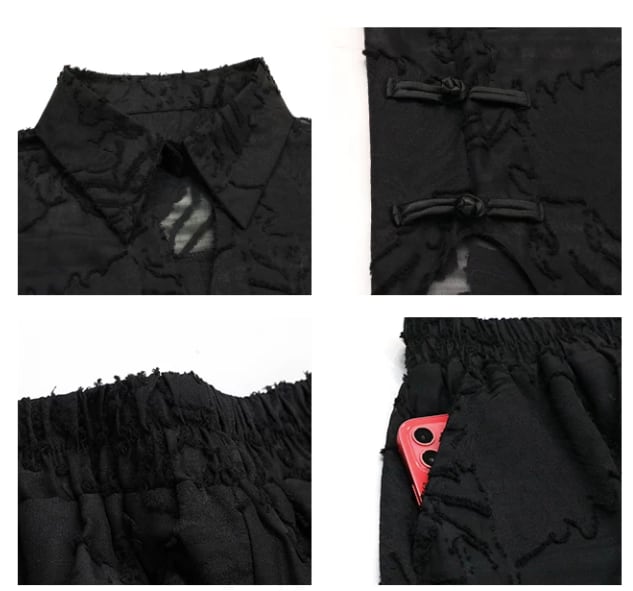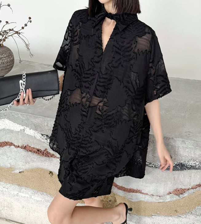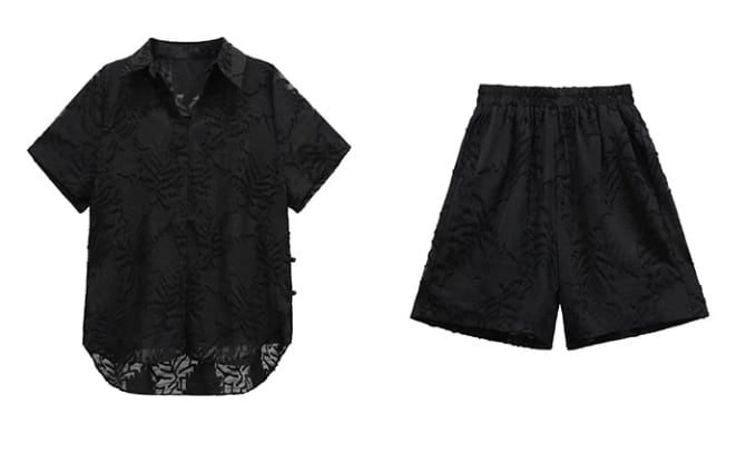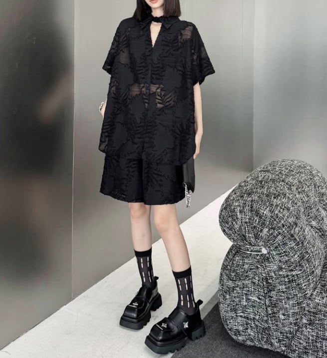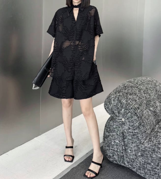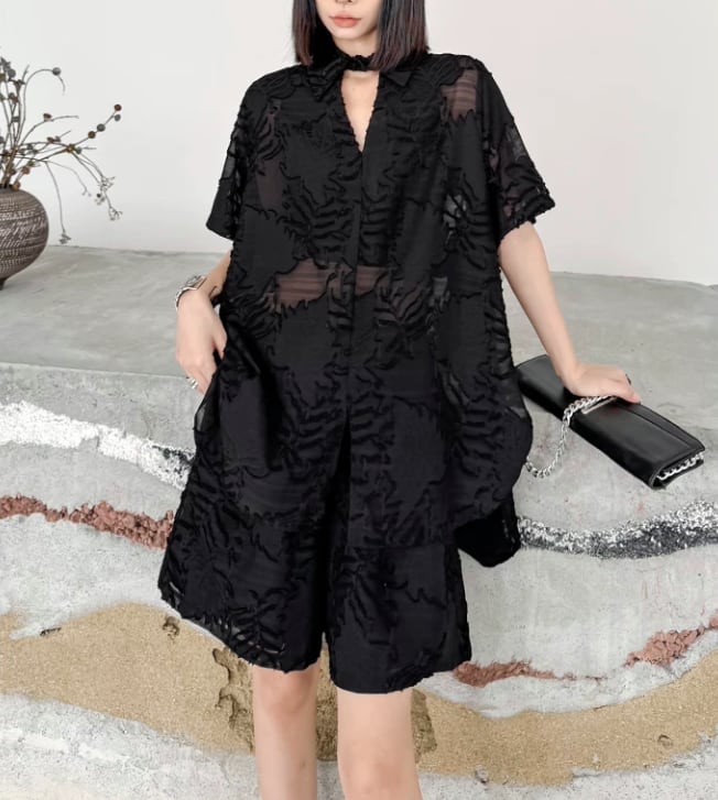洗練された印象を与えるブラックシースルーの植物柄シャツとショートパンツのセットアップ。シースルーのデザインが、軽やかな印象を生み出し、モードなスタイルを楽しむことができます!カジュアルな日常使いはもちろん、特別なシーンでも大活躍するアイテムです。