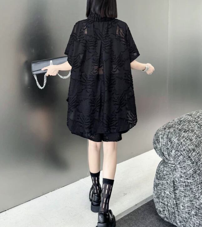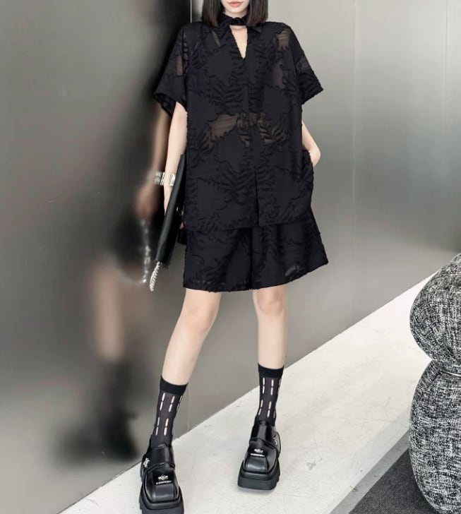 【モードなセットアップ】ブラックシースルー 植物柄 シャツ ショートパンツ/095