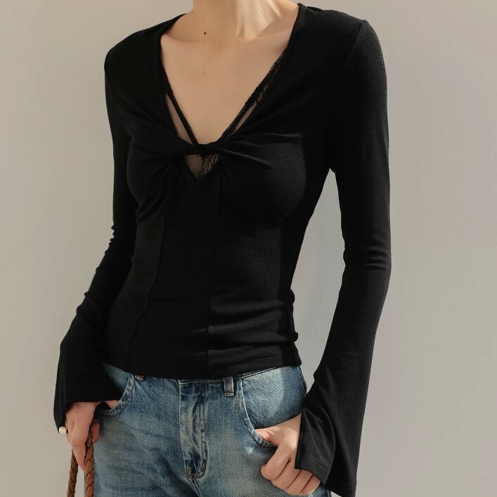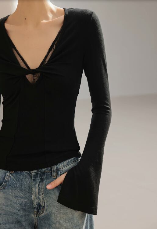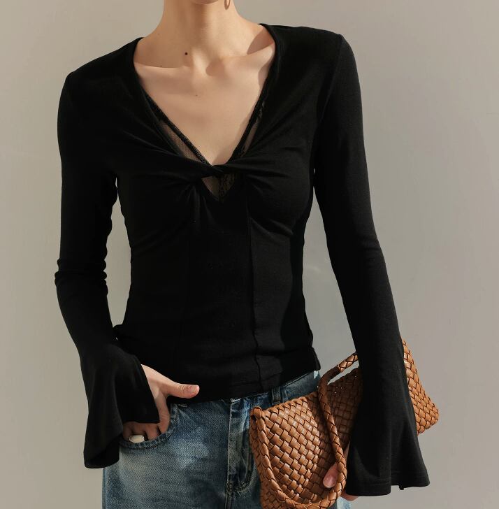 【ツイストVネック】ブラック 袖 フレア カジュアル /102