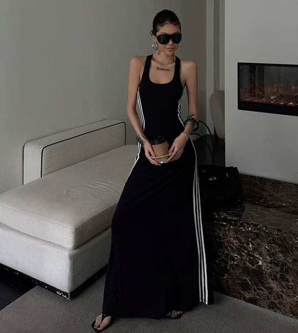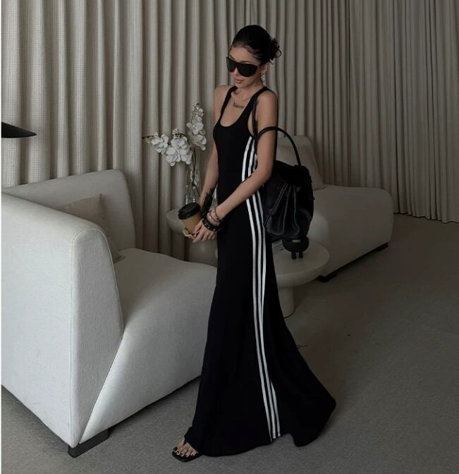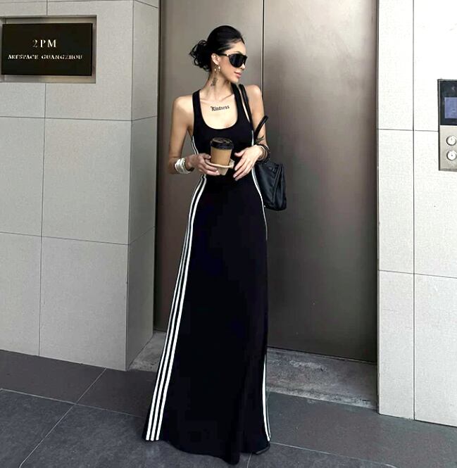 スタイリッシュなサイドラインデザインのブラックロングワンピースは、これまでにないモード感を演出するカジュアルアイテムです!シンプルながらも洗練されたシルエットが、大人の女性にふさわしいエレガンスを提供し、毎日のコーディネートに新たな息吹を吹き込みます。ブラックカラーの美しさが様々なシーンにマッチし、特別なお出かけからデイリー使いまで幅広くご活用いただける一品です。